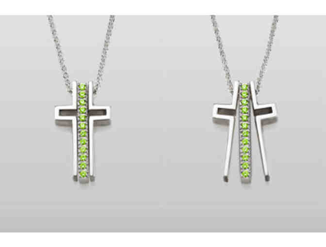 The Trinity Cross Collection embodies faith, hope and love. Exquisitely designed in silver tones, the three-piece cross represents the trinity with the two sides of the cross framing a bar of shimmering light peridot crystals. Cross is 1.25", in simple, modern design; on slender 18" shiny rhodium chain; lobster claw clasp. Representing Gratitude; "living in".