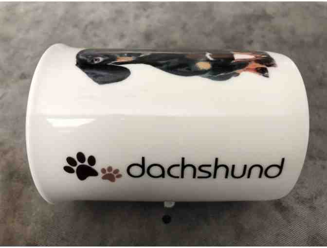 This adorable mug is 4" tall and 3" diameter. It is dishwasher safe.