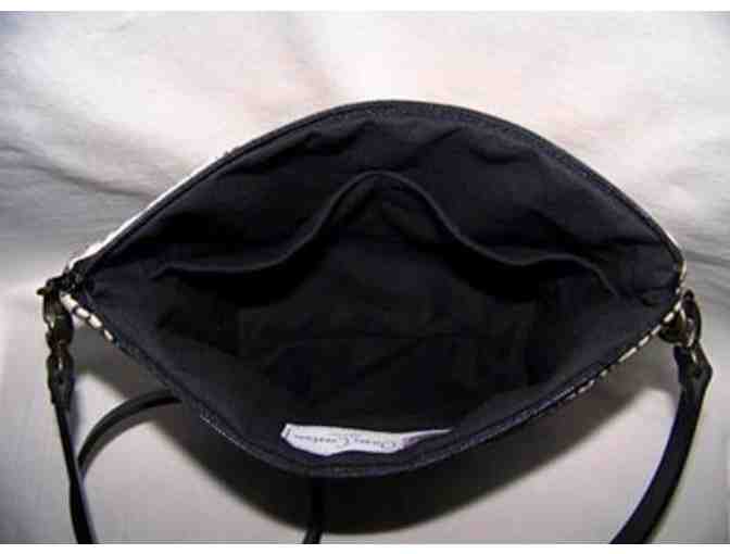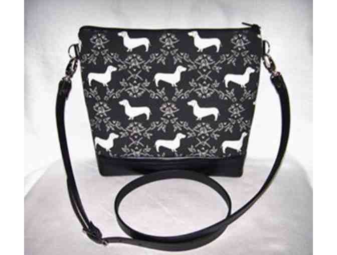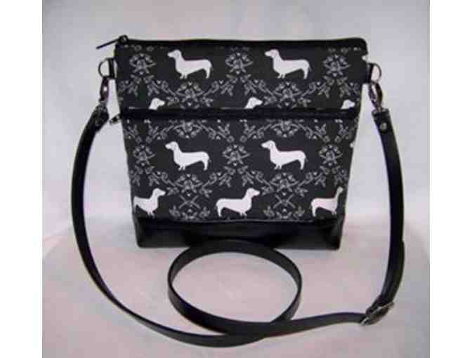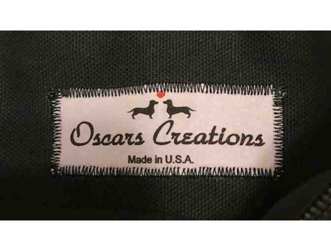 This adorable cross body bag handmade by Oscars Creations is 10" wide and 9" tall. Straps is 48" and adjustable. 2 pockets on the inside.