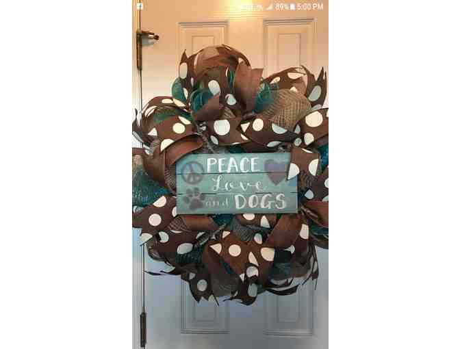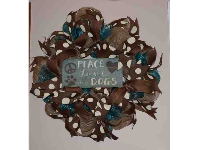 Beautifully Made Dog Lovers Wreath in the colors Brown and Blue with the saying Peace Love and Dogs