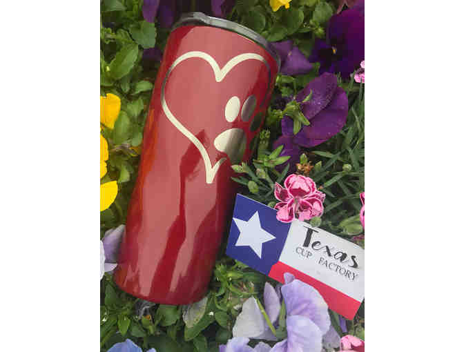 This listing is for either a 20 oz. stainless steel tumbler, with a TWISTED bottom. We just love this funky bottom! The tumbler is powder coated in deep red, leaving a wonderful heart and paw print design showing in stainless steel.