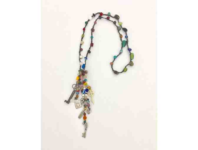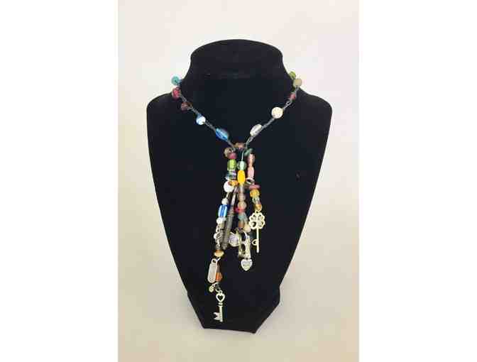 This one of a kind beaded handmade necklace is 15 inches long with an additional 6 inches of dangling beads and trinkets.