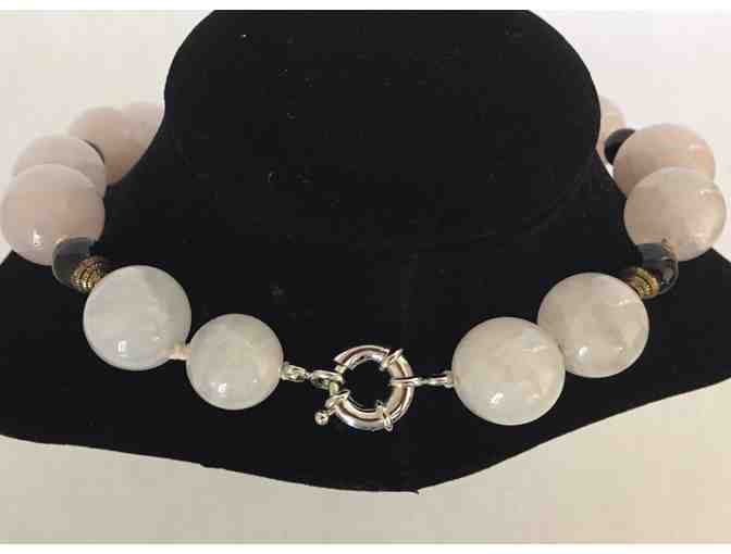 18", Brazilian bead necklace, one of a kind in the mid-century style. Milky agate and black beads with gold and silver colored findings.