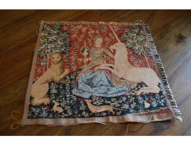 Petite yet detailed replica of the famous "Lady and the Unicorn" tapesty in the Cluny Museum. Measures approximately 10 inches by 10 inches. First time offering this in our online Auction!