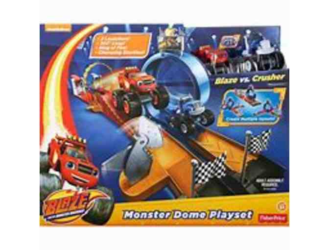 It’s Race Day at the Monster Dome and crafty Crusher will stop at nothing to beat Blaze... even if that means building a chomping Sharkbot! Will Blaze race past the shark’s mighty bite and speed on to win the race or will Crusher finally cross the finish line first? This track set can be configured into multiple layouts so race fans can recreate all the action and adventure of Blaze and the Monster Machines! Create side-by-side races between Blaze and Crusher or customize your set into champion courses of your choice! Using the two launchers, see if you can give the Monster Machines the speed and momentum they need to race around the track and perform spectacular stunts! Try to launch the trucks up the ramp and into a 360° loop or speed through the ring of fire! The Monster Dome Playset includes Blaze and Crusher vehicles. Ages 3+