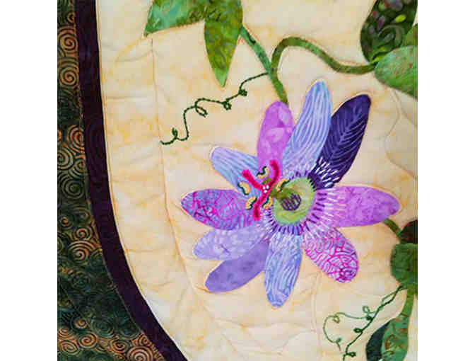 Stunning quilted wall hanging with vibrant purple passion flowers on a golden yellow background. The attention to detail will make this a treasured art piece to be displayed in your home. Measures approximately 25" X 35".