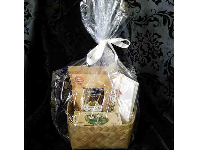Gift Basket containing an exclusive NTBG Blend of Hawaiian whole bean coffee (8 oz), Box of Passionfruit Tea (25 pack), and a complete set of 8 botanical illustrated Isabella Sinclair notecards and envelopes