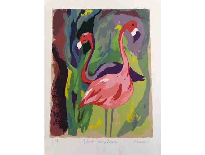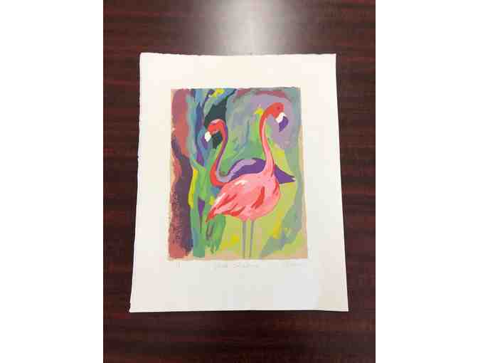 This vibrant, flamingo painting is sure to brigthen up your home! The colors bounce off the silkscreen. At 13inx16in, it's the perfect size for your living space!