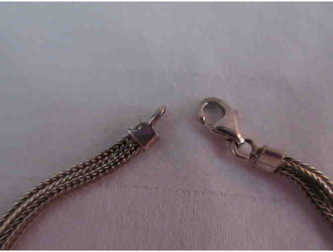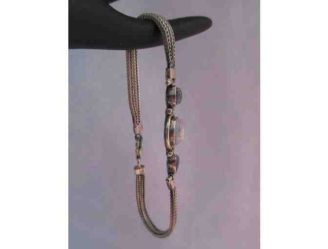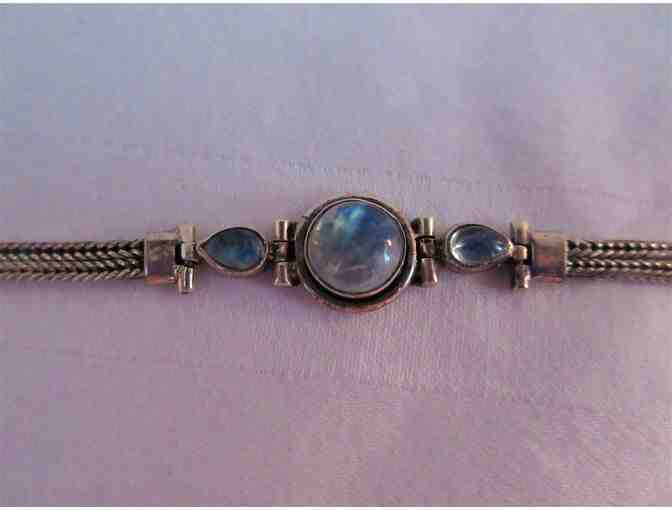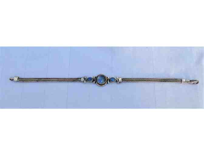 The bracelet has a blue opal center piece with two smaller pieces on each side with a braided silver color chain that closes with a clasp closure. The bracelet measures 7 1/4" and the center piece is 1/2" in diameter.