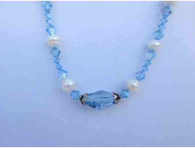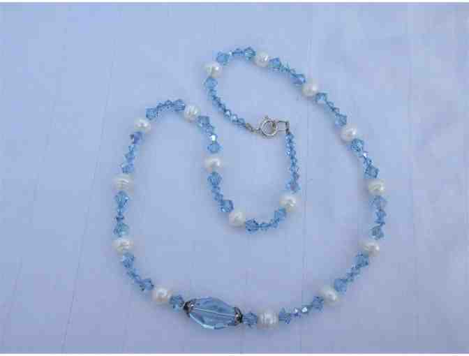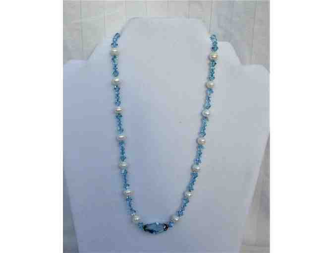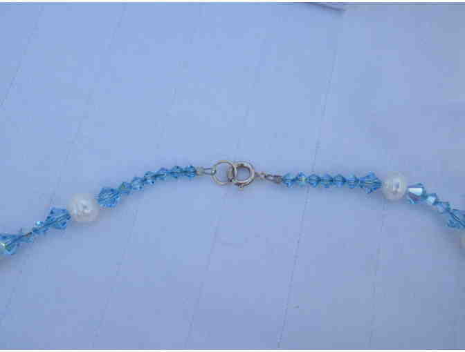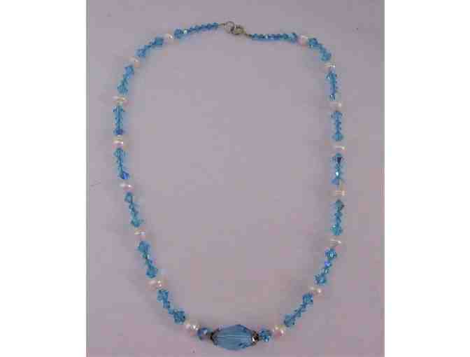 The blue and white bead necklace will bring the colors of the sea to your wardrobe and will be a great addition to your costume jewelry collection. The necklace is anchored by larger blue beads to enhance the style.