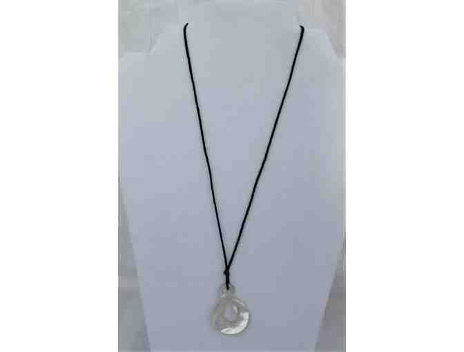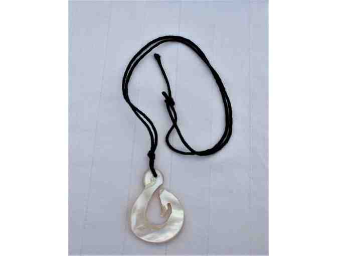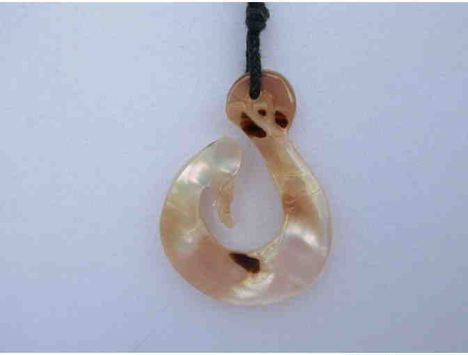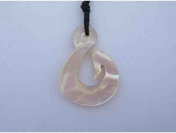 A hei matau is a bone carving in the shape of a highly stylish fish hook that is typical of the Maori people of New Zealand. This design represents strength, good luck, and safe travels across water. The shell hook pendant is on a black cord.