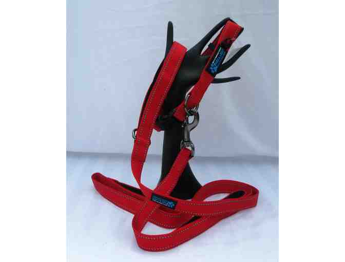 This pacakge includes a large red collar and triple handle leash from Max and Neo Dog Gear.