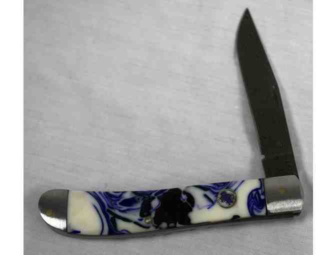 The handles are made from molded purple and white acrylic and the blade is made from stainless still.