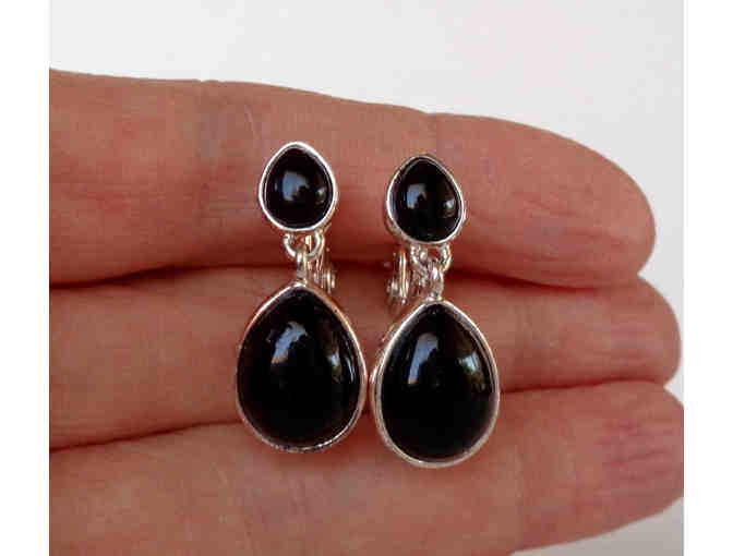 Double drop black stones in cabouchon settings. Clip-on earrings measure 1" long. Made by Napier.
