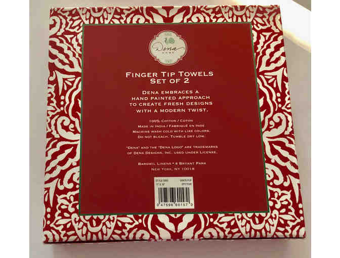 The Christmas Pup cotton fingertip towel set from Dena contains a pair of towels featuring a dog sporting a Christmas hat, which is sure to bring holiday cheer to those around you. Set is gift boxed and includes 2 fingertip towels measuring 11" W x 18" L. All cotton. Machine washable.