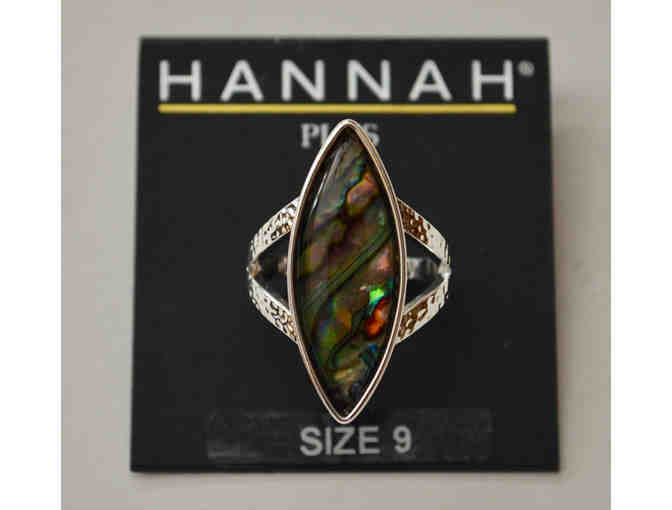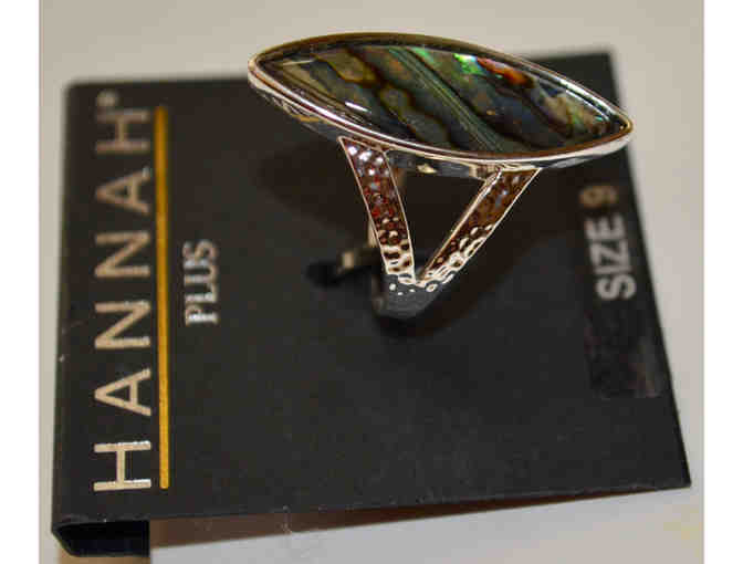 This contemporary ring from Hannah is the perfect accent to any outfit. The elongated colorful faux abalone stone is set in an open silver-tone hammered band. Size 9. Comes in gift box. Very nice!