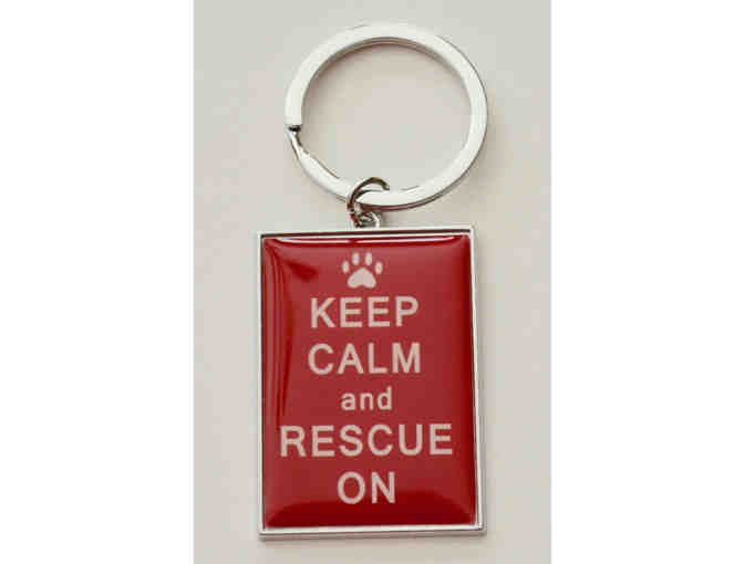 No matter where your travels take you, our colorful and paw printed keychain keeps the still waters flowing. Originally a British inspirational war-time poster, the message to "Keep Calm" carries on in a message of love and awareness for shelter animals. Entire message reads: "Keep Calm and Rescue On". Measures 1.75" H x 1.25" W (4.4 x 3.2 cm). Silver-tone with red enamel and white lettering.