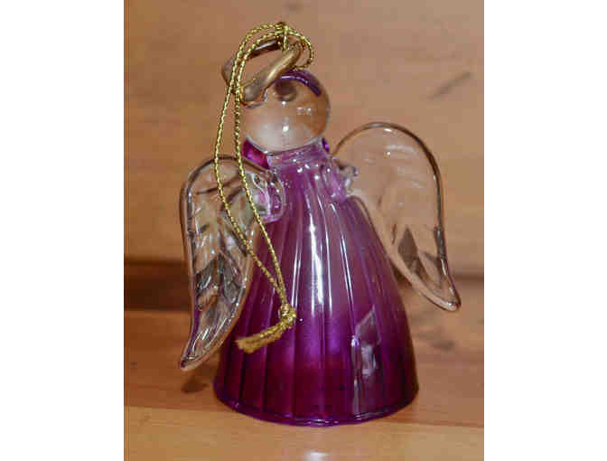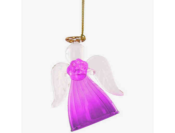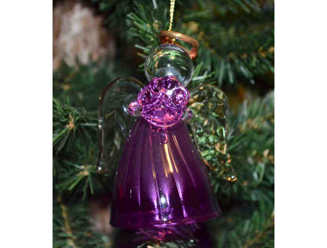 Celebrate the holidays or use this versatile piece year-round as table decoration while honoring your four footed friends. Our delicate glass angel for your tree holds a hand-painted purple paw for an unmistakable show of love for your animal companions. Has gold halo and hanging ribbon. Ribbon can be easily removed so Angel can be used as table or shelf decor. Measures 3.25" H (8.2 cm).