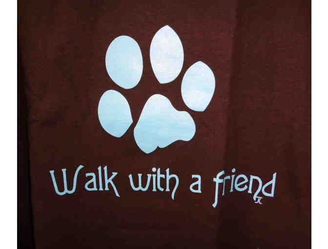 As long as you've got a dog, you'll never walk alone. With a great big paw and the advice of a lifetime, our t-shirt honors your daily duty to your best friend. In rich chocolate brown with jubilant turquoise design. Size Large.