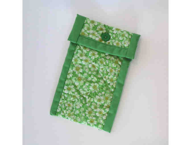 Nicely made 100% cotton eye glass case to carry or for your handbag. White floral print on green with green binding. Measures 4" x 7". Button closure.