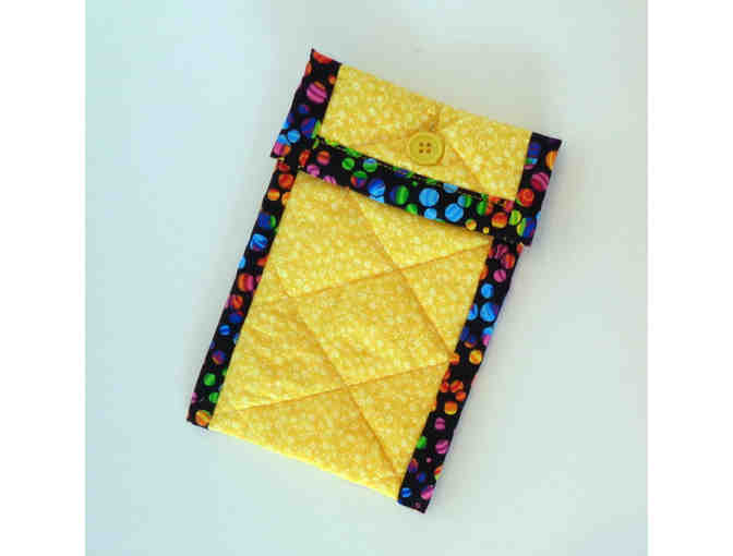 Nicely made 100% cotton eye glass case to carry or for your handbag. Yellow floral print with colorful circle print on black binding. Measures 4" x 7". Button closure.