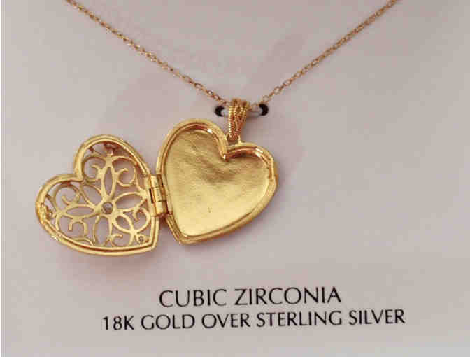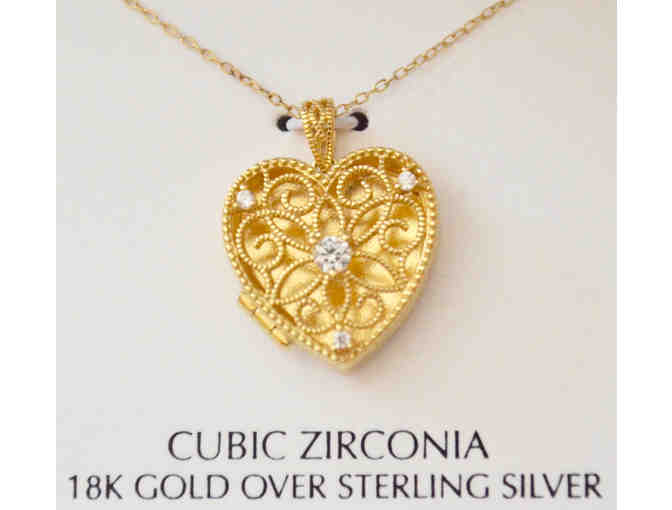 The vintage-inspired beauty of this 18K gold on sterling silver filigree locket pendant necklace is fashioned with an openwork design and cubic zirconia accents. Opens to display a favorite photo. Delicate chain is 18" long and heart pendant is 7/8" long. Has spring ring clasp closure. Comes in gift box.