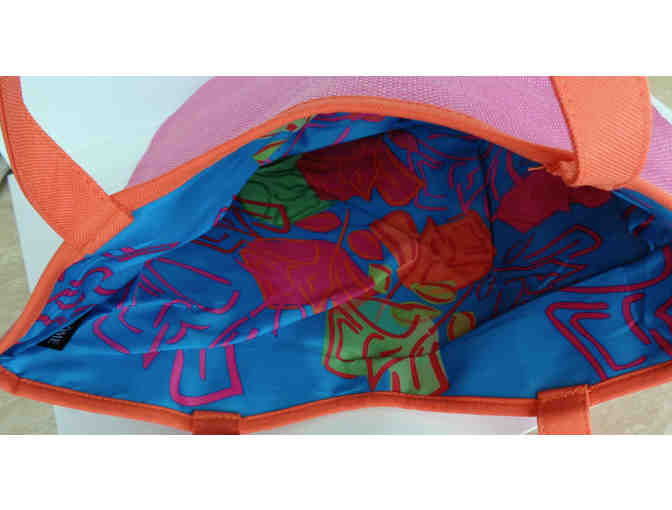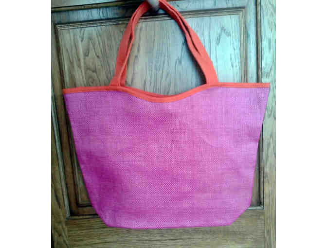 This tote bag is useful all around. Hot pink with orange handles and trim and colorful lining. Measures 17" x 12". Perfect for beach or shopping!