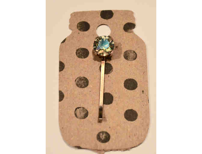 Pretty hairpin with single sparkling iridescent Swarovski crystal that reflects surrounding light and colors. Measures 1.5” long and crystal measures .25” diameter. Very well made. Comes on cute bottle-shaped card in gift box.