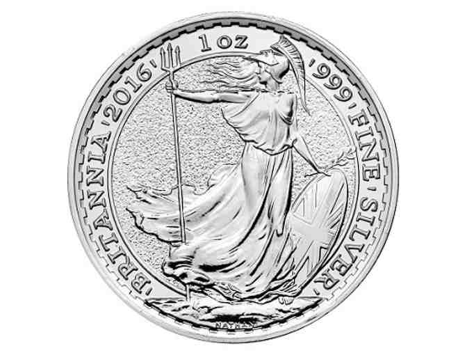 The 1oz silver Britannia coin contains one troy ounce of fine silver and is produced each year by the Royal Mint. Each 1oz silver Britannia is imprinted with a "face value"; this one ounce coin is set, although the value is of course based on the market price of its metal content.