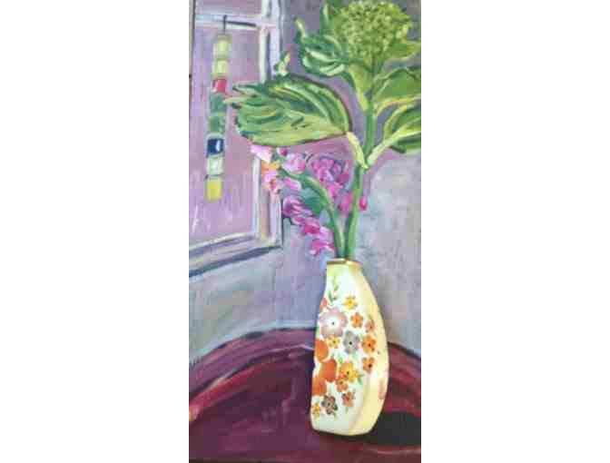 The Story: Gaby says, " The vase was on the table and I moved in and it broke. I was about to throw it out and I thought the vase is so pretty...I'm going to adhere it to a piece of wood. And then this painting happened. I love what I got"