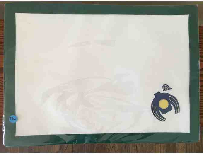 Set of 2 embroidered placemats with blue and yellow racing jockey jacket and helmet design in the corner.