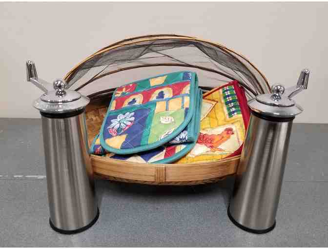 Round outdoor serving basket with net cover; Salt and pepper grinder; hotpads