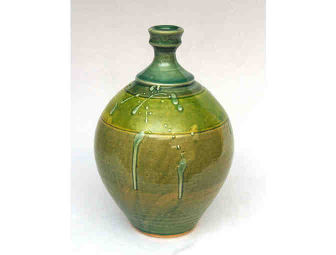 This traditional stoneware bottle was thrown on the potter's wheel and decorated with slips. The different colored slips show through the final glaze creating many shades of green and blue. The narrow neck makes it the perfect tall bud vase.