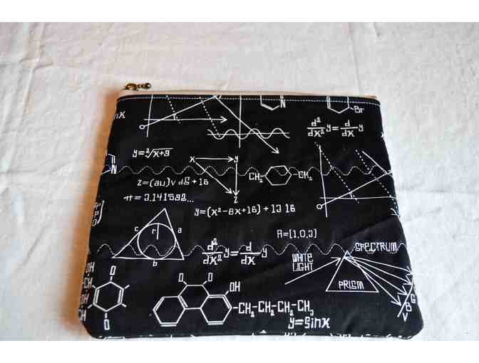 A 7.5" x 8.5" black science icons pouch with metal zipper, handmade by Mrs. Yanashima.