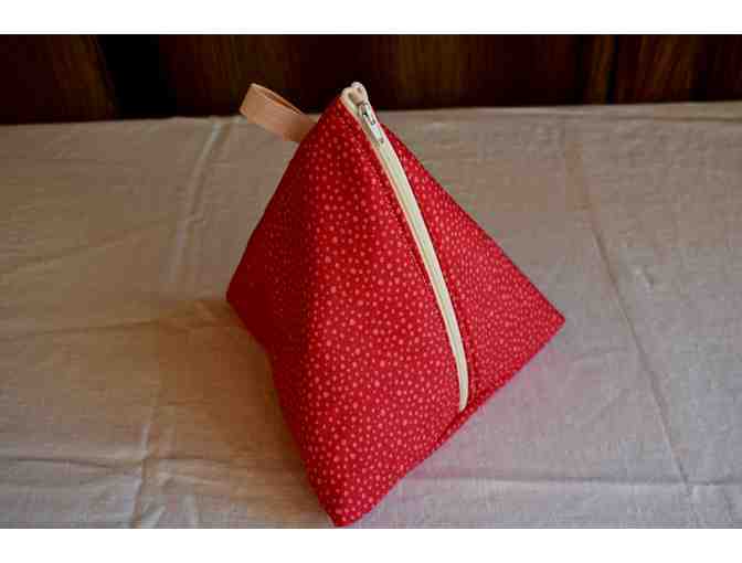 A 7" pyramidal pouch in red dot fabric with yellow zipper, handmade by Mrs. Yanashima.