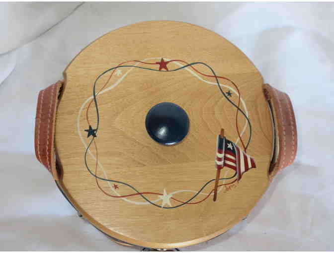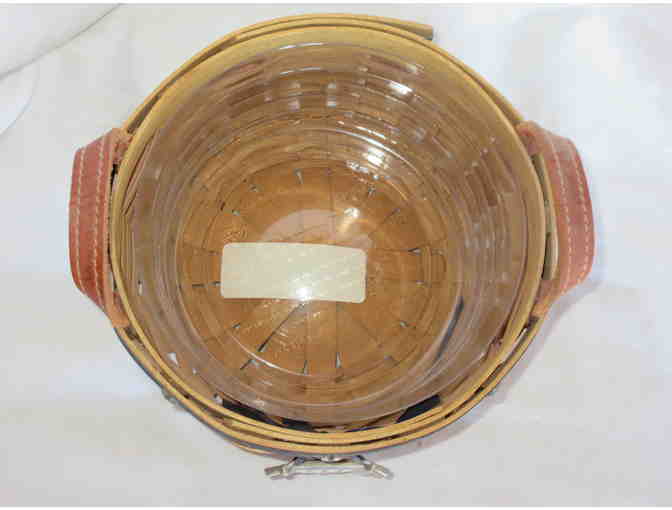 Longaberger Proudly American Darning Basket Includes with this basket has a plastic protector and the Americana tie on. Leather handles.
