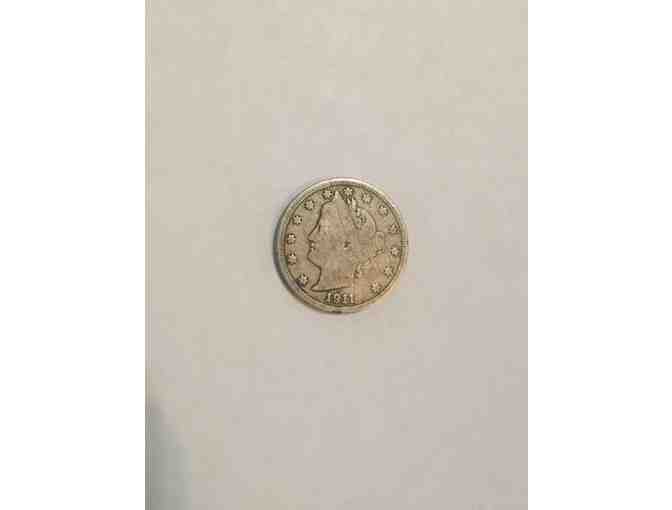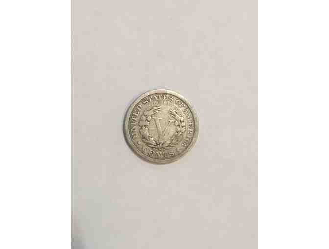 The Liberty Head nickel, sometimes referred to as the V nickel because of its reverse (or tails) design, is an American five-cent piece. It was struck for circulation from 1883 until 1912, with at least five pieces being surreptitiously struck dated 1913. The obverse features a left-facing image of the goddess of Liberty.