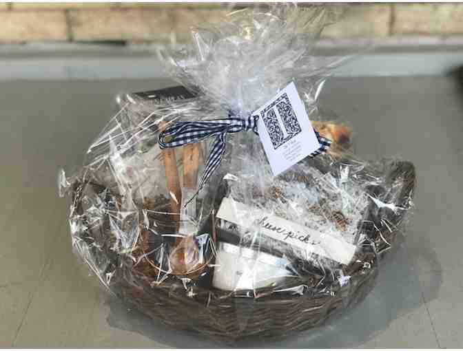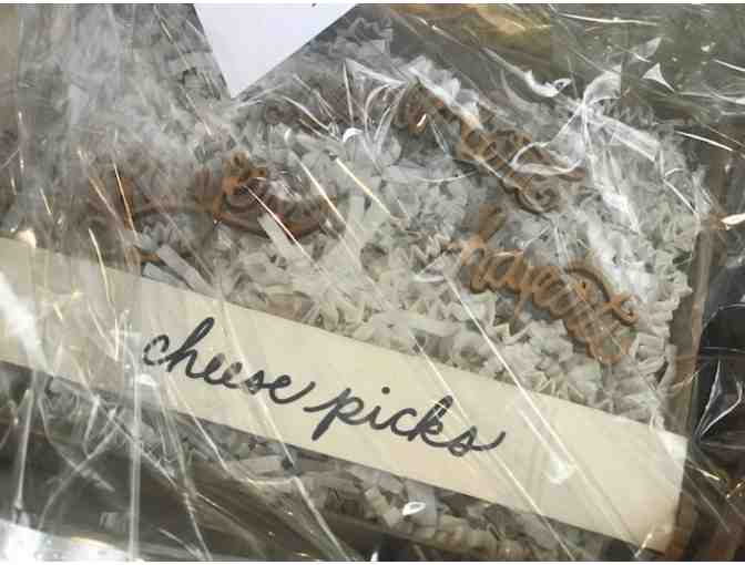 Hostess Basket - 3 boxes of cheese picks, a dip bowl, make a wish jar, 2 maple spoons, a marble cheese board and 2 cookbooks.