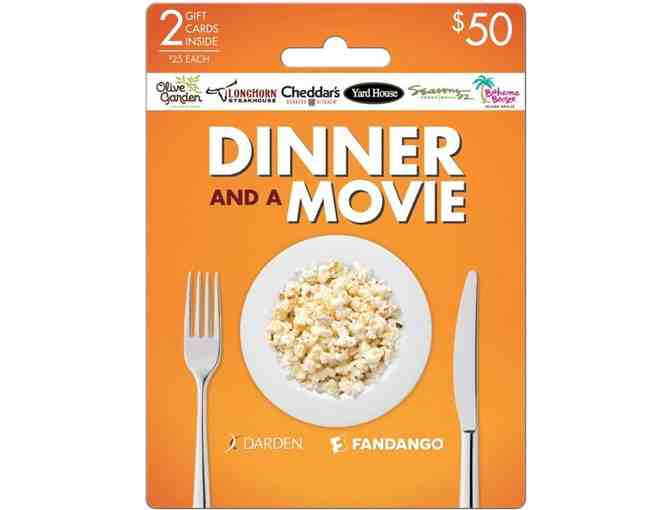 Create the perfect date night with this Dinner and Movie Darden Fandango $50 gift card pack, which is redeemable for up to $25 of movie tickets from Fandango and $25 to one of the following restaurant choices: