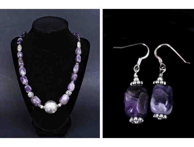 Beautiful amethyst and silver beaded necklace (20") and dangle earrings handcrafted by Candee S Condray of Candee's Dandy Designs.