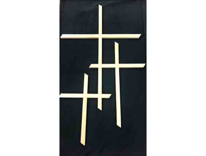 Cross artwork handmade by student Luke Balezentis, class of 2020. The wood is from the Bishop Kelley gym floor. Measures 3 1/2' x 2 1/2'.