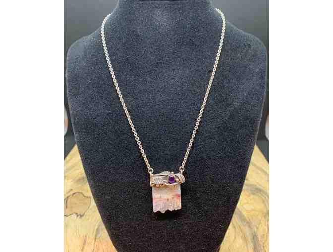 Varied textured metals of our own creation combined with rare fossils and unique stones are our signature pieces, each a product of the imaginations of two very different designers and the combined 65 years of jewelry design experience. The natural beauty of these materials is the inspiration that drives our creations. Each one is handcrafted in our shop and displayed here and at juried art shows with pride.