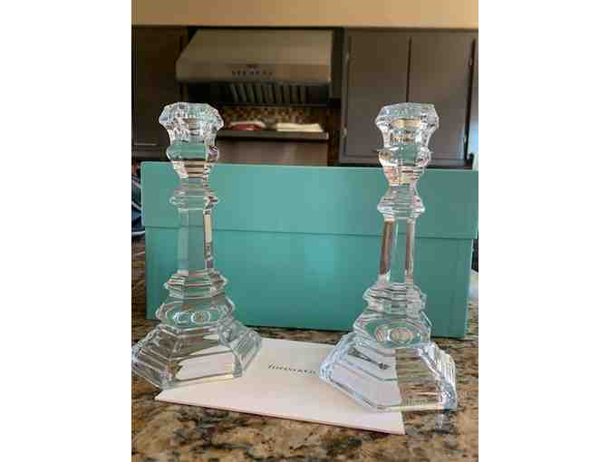 This beautiful pair of crystal candlesticks are from Tiffany & Co. Includes signature blue box.