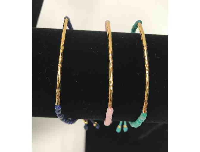 A grown-up take on the friendship bracelet from Gorjana, accented with a hammered bar and replete with dusky earth stones.