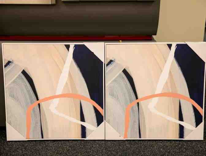 Modern art in blues, peaches and white, wrappped in canvas in white frame.
