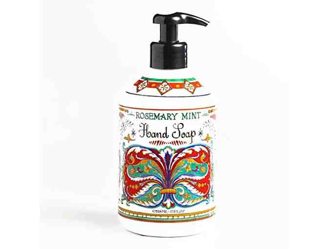 The Deruta Rosemary Mint Hand Soap features a beautifully intricate design inspired by fine ceramics from Italy
