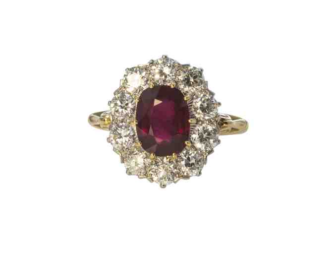 From Croghan’s estate collection, this antique English- made ring features an oval, faceted 2.25ct ruby set in 18K yellow gold. The ruby is dark, strong and slightly red-orange. Surrounding the ruby are 10 old European- cut diamonds that are prong set in platinum.