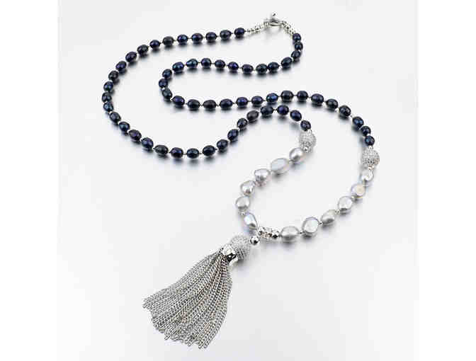 Meet your new favorite go-to piece for timeless elegance and luxury: The Silver Freshwater Pearl Tassel Necklace. Genuine silver and charcoal freshwater pearls accented with Swarovski crystal disco balls end in a beautiful silver chain tassel adding luminosity, modern flare and movement!
