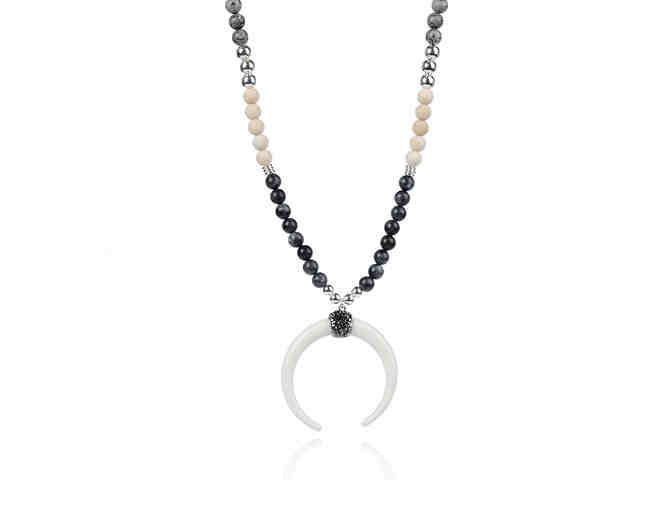 This item is accompanied by a White Horn Pave Pendant & Gray Stone Necklace. Hand-strung gray agate, silver and fossil stone beads accent a white pave horn to create a stunning bohemian statement. Add this necklace to any outfit for a look that's sure to turn heads!