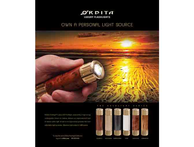 ORBITA's Goldlight Series Luxury LED Flashlight Set features five user-selectable lighting programs: High, Medium, Low, Defense, and S.O.S. Signal beams. 24 Karat polished gold plated end caps sandwich the exotic Cocobolo would native to Costa Rica. Includes Presentation Case, Holster Case, Rechargeable Lithium Batteries and Charging Station.